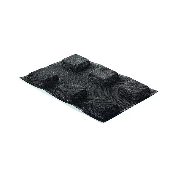 L'innovativo stampo microforato è in silicone e fibra di vetro, con cavità quadrate per dolcetti monoporzioni di forma quadrata.