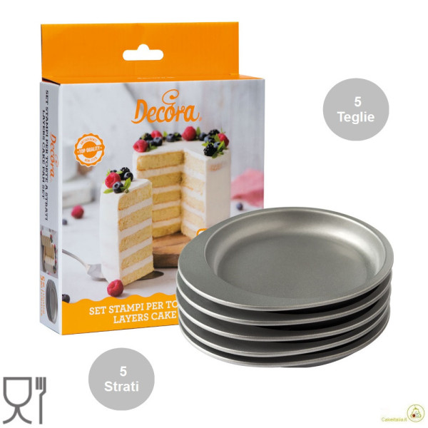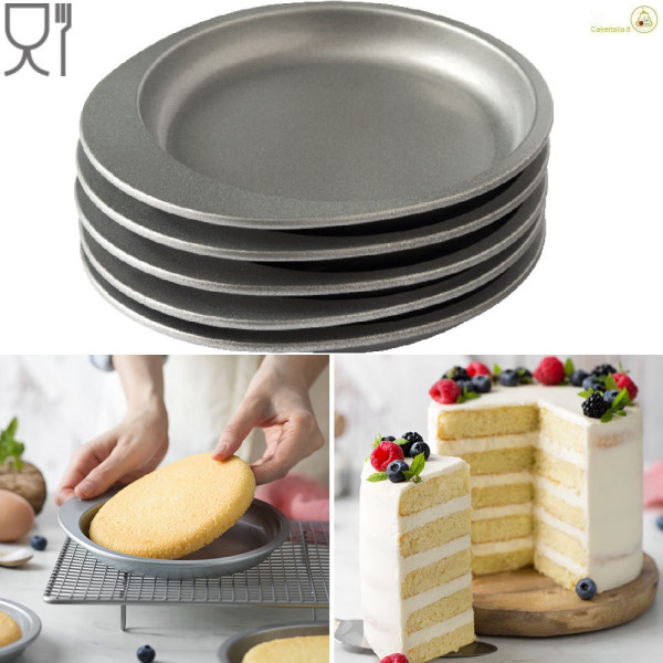 Set 5 stampi tondi antiaderente in alluminio anodizzato alta qualità per uso intensivo e professionale, diametro 15 cm, alte 3,5 cm per torte a strati di colore e gusti differenti, da Decora.