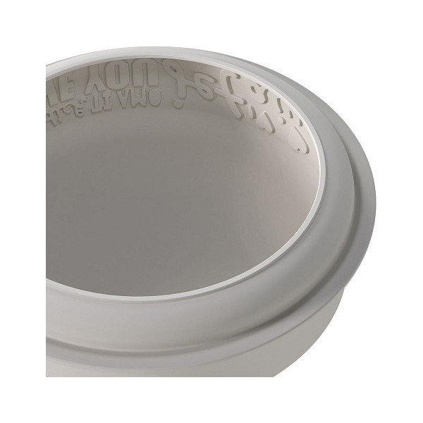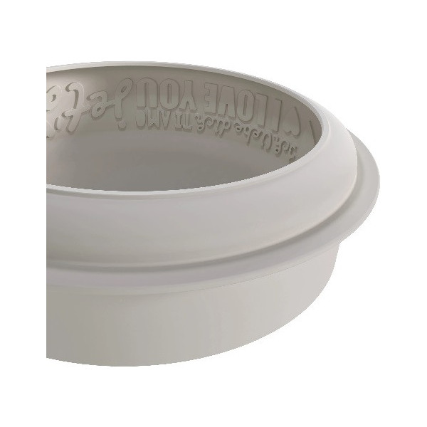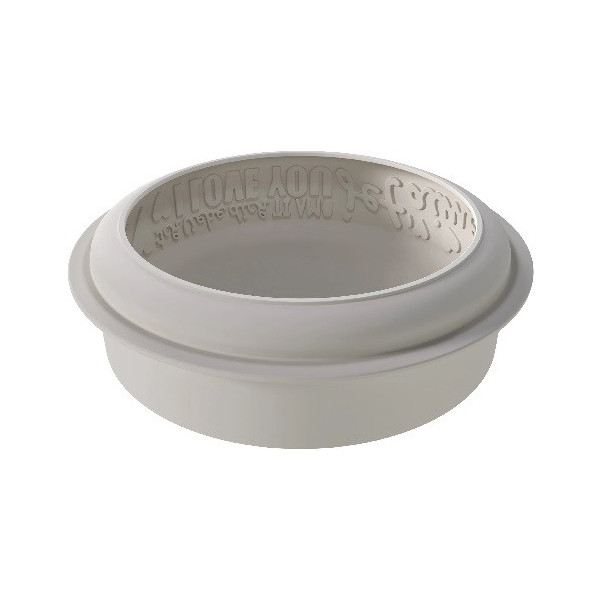 Stampo Endless Love, in silicone grigio da Silikomart per torte tonde con decoro scritta amore senza fine sul lato, diametro di 19 cm ed altezza 5,5 cm e volume 1200 ml