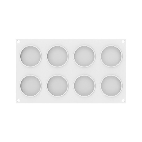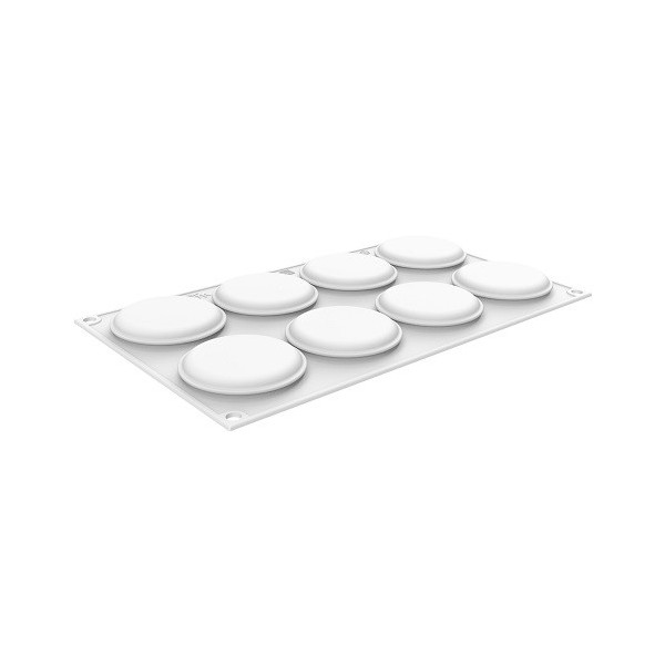 - 1 stampo in silicone bianco, con 8 cavità a forma tonda di diametro 64 mm ed altezza 11 mm e volume di 35 ml,
