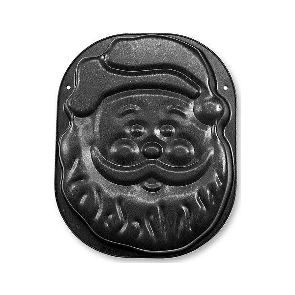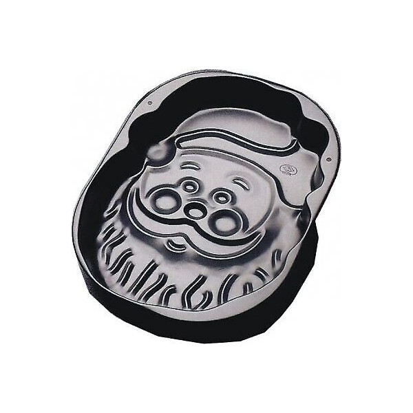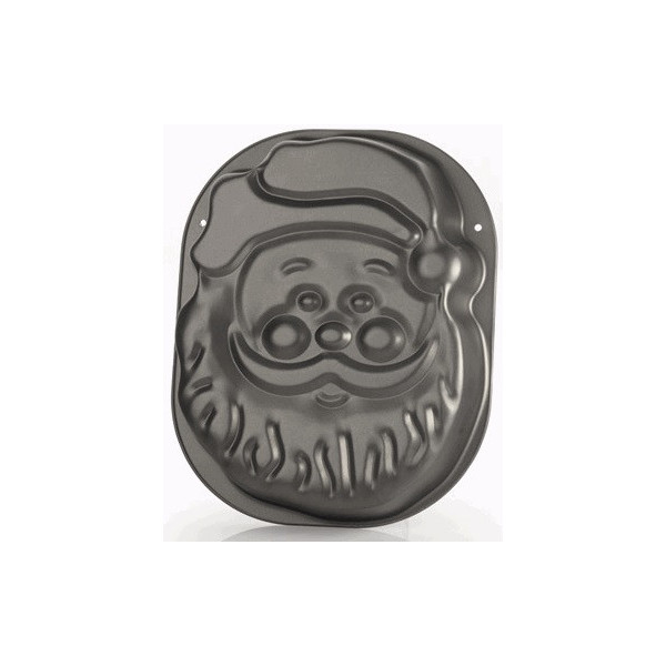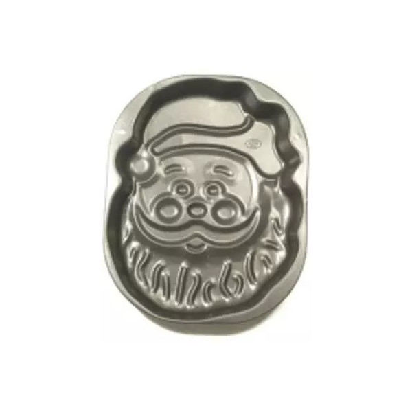 Stampo in alluminio antiaderente a forma di viso di babbo natale, per torta lunga 360 mm, larga 285 mm ed alta 50 mm.