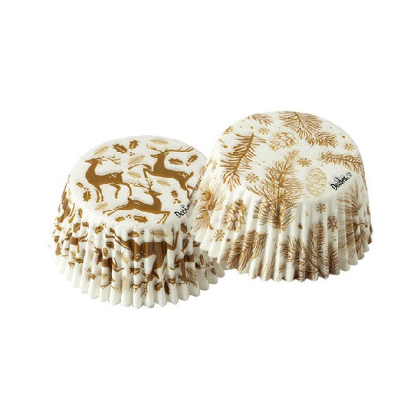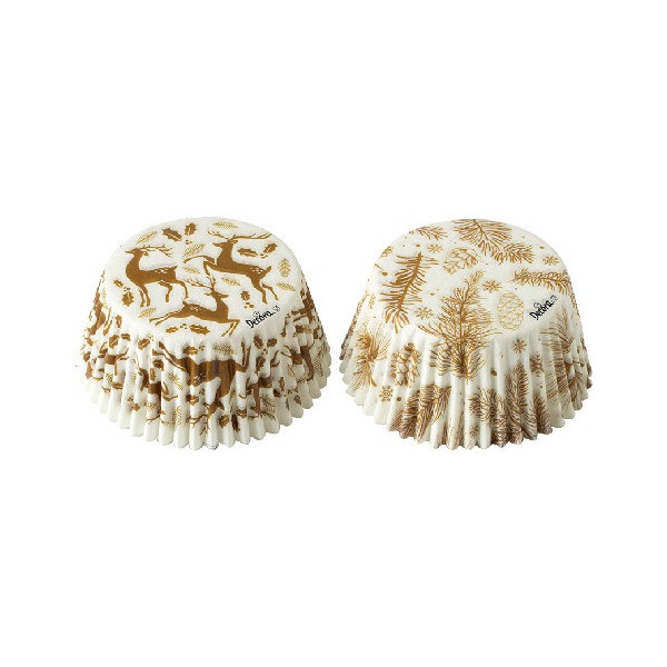 Pirottini in carta forno antiaderente con decori di cristalli di neve, stambecchi, agrifogli color oro, diametro 5 cm h 3,2 cm da Decora.