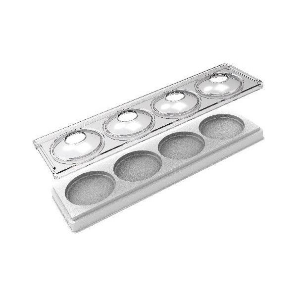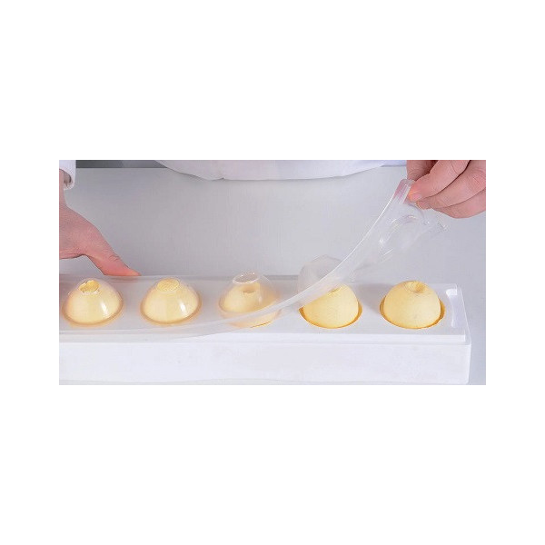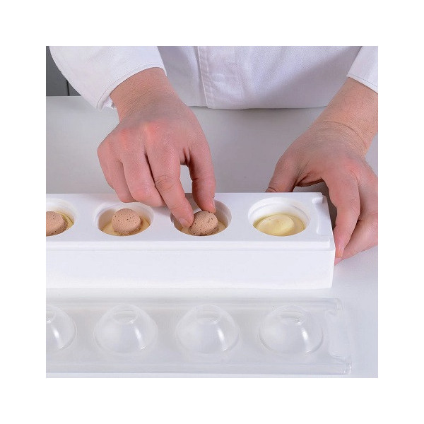 Kit MUL3D pebble per gelati, mousse e semifreddi da Silikomart è composto da: uno stampo base in silicone bianco e uno stampo a copertura, top trasparente ed un vassoio. Ideale per 4 gelati, mousse e semifreddi a forma di ciottolo o sasso 3D ø80 h 35 mm