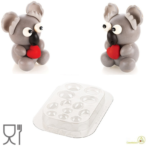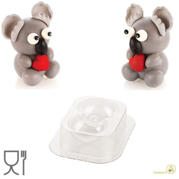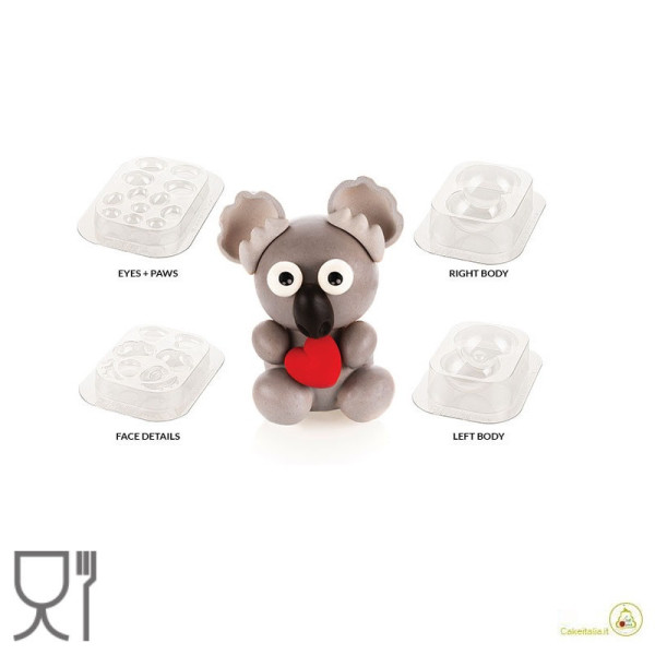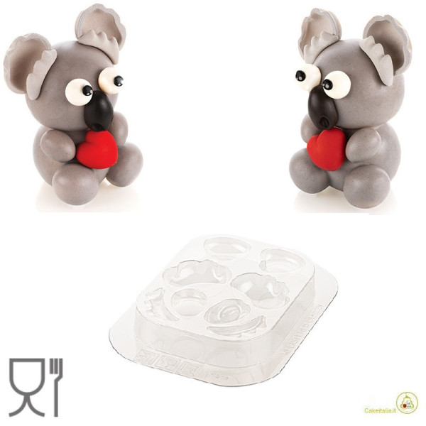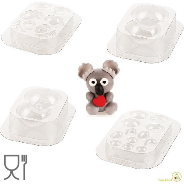 Kit koala Silikomart: set 4 stampi in plastica morbida termo-formata per realizzare koala in cioccolato di 3 dimensioni, largo 15,5 cm circa, profondo 11,6 cm circa ed alto 16 cm circa ideale decorazioni di cioccolato.