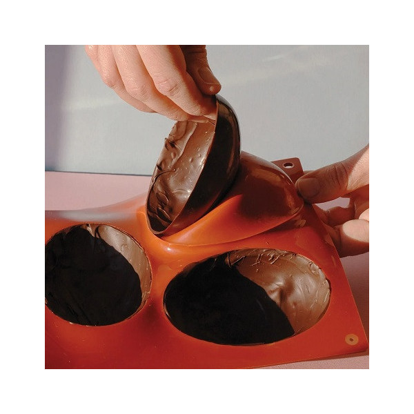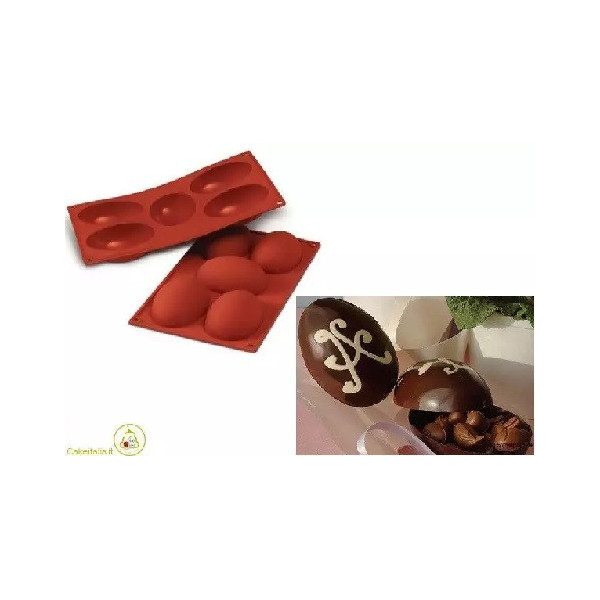 Stampo uova da Silikomart: stampo in silicone per 5 cavità a forma di mezzo uovo, 102x73 h 36 mm, in silicone flessibile e antiaderente, ideale per uova di cioccolato.