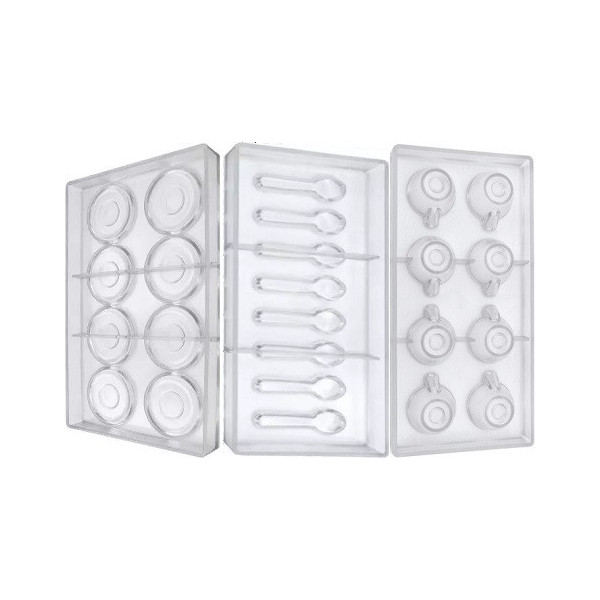 Stampo cioccolato Kit Servizio Caffè o Thè: set di 3 stampi in policarbonato, professionale, a forma di cucchiaini con piattini e tazze grandi da caffè o thè.