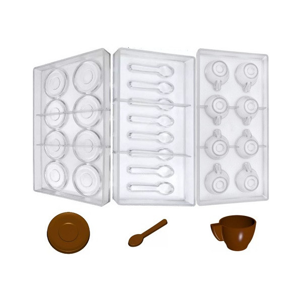 Servizio caffè composto da 3 stampi in policarbonato per cioccolato: stampo per cucchiaino cioccolato, stampo per piattino di cioccolato e stampo per tazzina caffè di cioccolato