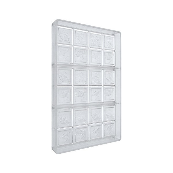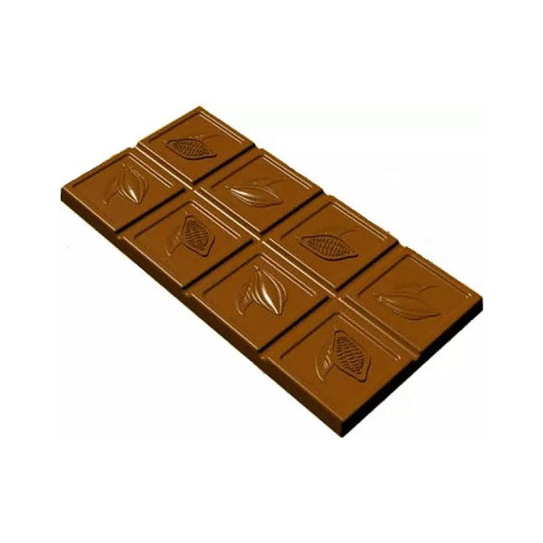 Stampo cioccolato tavoletta rettangolare con decoro Cabossa dal peso di 100 g, composta da 3 cavità lunghe 16 cm, larghe 8 cm ed alte 75 mm. Ogni tavoletta è suddivisa in 8 quadretti con decoro Cabossa.