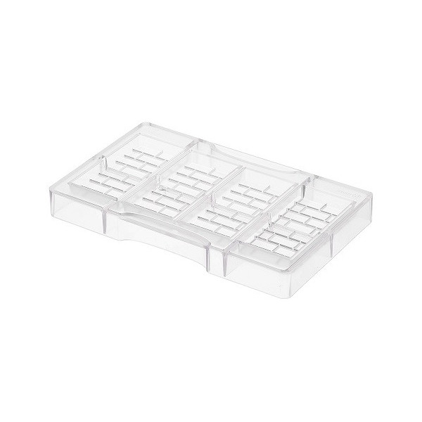 Stampo cioccolato tavoletta di Modica da 100 g: stampo in policarbonato per 4 tavolette, a forma rettangolare, con 4 quadretti, di dimensioni 137,5x55xh13 mm.