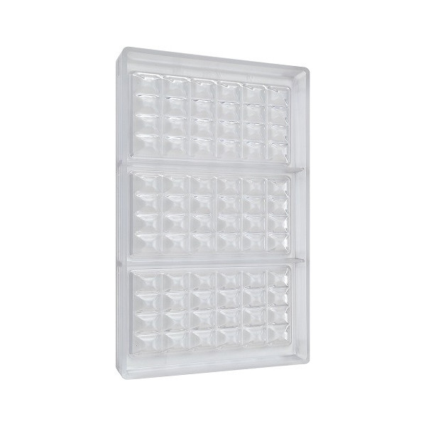 Stampo tavoletta di cioccolato rettangolare dal peso di 100 g, composta da 3 cavità lunghe 150 mm, larghe 75 mm ed alte 8,4 mm. Ogni tavoletta è suddivisa in 6x4=24 quadretti.