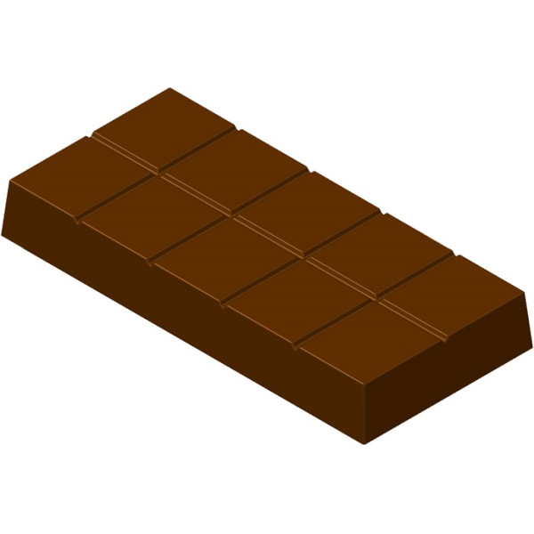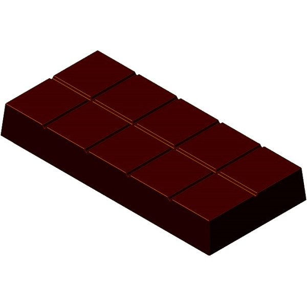 Stampo Cioccolato Tavoletta rettangolare onda dal peso di 50 g, composta da 4 cavità lunghe 120 mm, larghe 60 mm ed alte 6,3 mm. Ogni tavoletta è suddivisa in 10 quadretti.