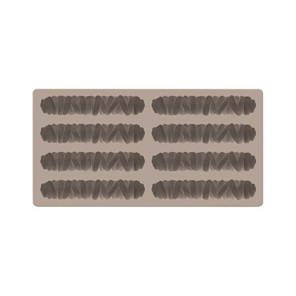 Onda B linea Chocado da Silikomart: stampo in Tritan per 10 barrette di cioccolato con decoro a onde, composta da 10 cavità lunghe 12 cm, larghe 2 cm ed alte 1,5 cm e volume 26 ml.