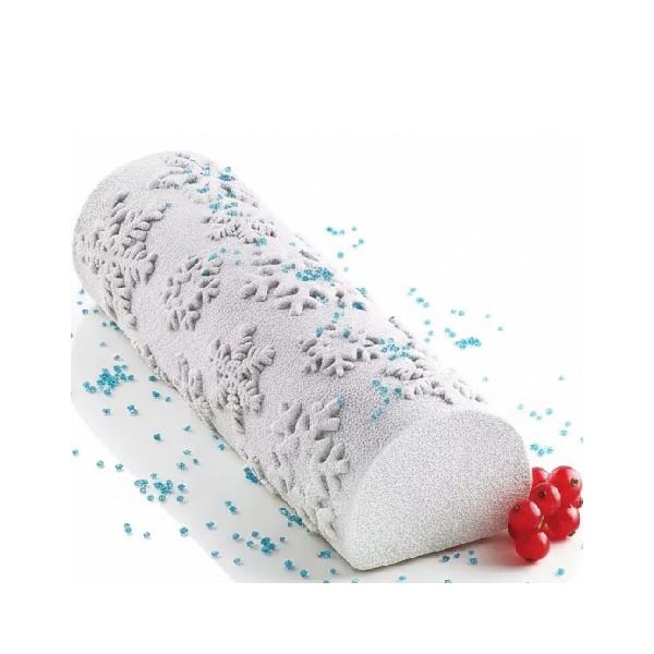 Frozen Bûche Silikomart. kit stampo tronchetto per gelato e semifreddi fiocchi di neve da Silikomart è composto da: supporto per torte a forma di tronchetto + tappeto in silicone decoro fiocchi di neve + tappeto in silicone effetto liscio