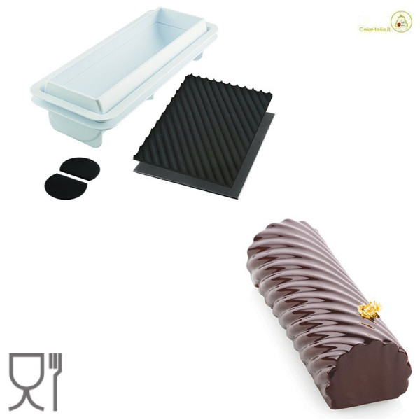 Spiral Roll 1100 Silikomart. kit stampo tronchetto per gelato e semifreddi rotolo a spirale da Silikomart è composto da: supporto per torte a forma di tronchetto + tappeto in silicone decoro rotolo a spirale + tappeto in silicone effetto liscio