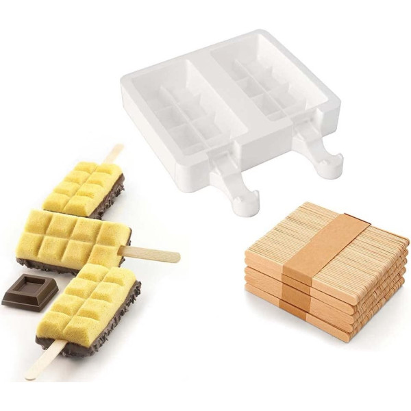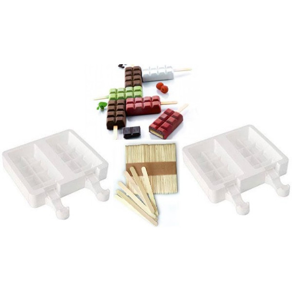 Chocostick Silikomart 4 gelati tavolette: stampi in silicone Gel02. Kit composto da 2 stampi per gelato Chocostick in silicone (per un totale di 4 cavità), cinquanta stecchi in legno, un ricettario