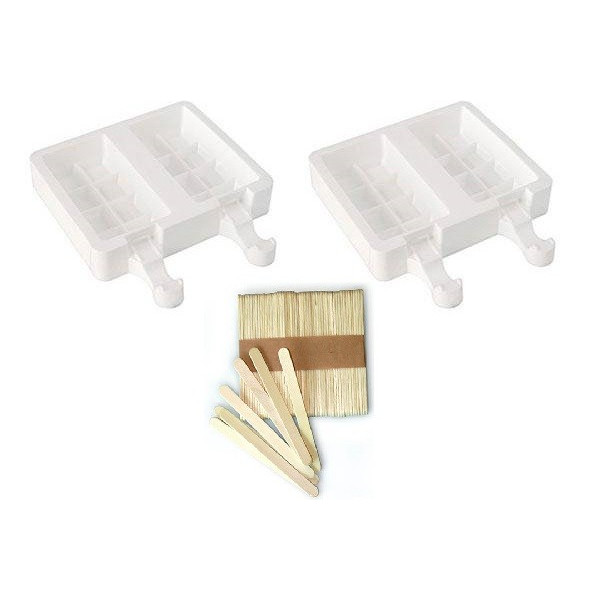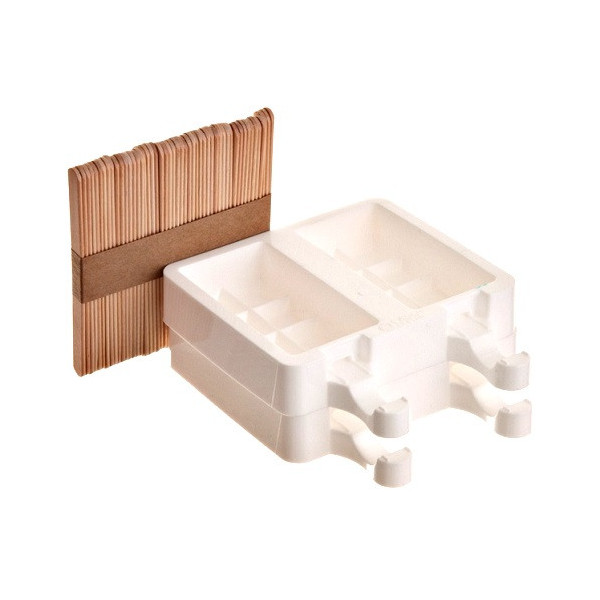 La confezione contiene: 2 stampi in silicone (per un totale di 4 cavità), cinquanta stecchi in legno, un ricettario