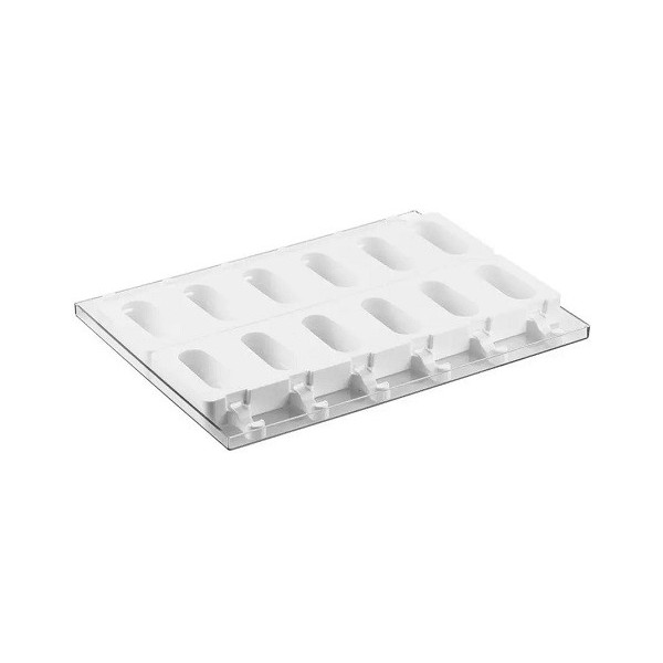 Gel 14 3D: set 2 stampi gelati totalmente tridimensionali alti 9,3 cm in silicone Top White (ogni stampo ha 6 cavità, lunga 93 mm, larga 43 mm ed alta 25 mm) + 1 vassoio in ABS da 40 cm x 30 cm + 50 bastoncini in legno di faggio, da Silikomart. Oltre a stampo per gelato, usalo anche per preparazioni da forno dolci o salate.