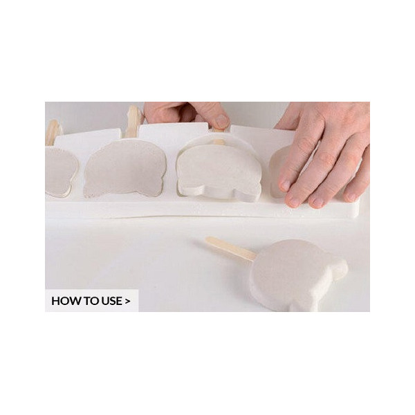 GEL08 Cat Silikomart, set per gelati Gattino: 2 stampi in silicone Top White (4 cavità 88,5 x 82 x h 20 mm) + 1 vassoio in ABS da 40 cm x 30 cm + 50 bastoncini in legno di faggio.