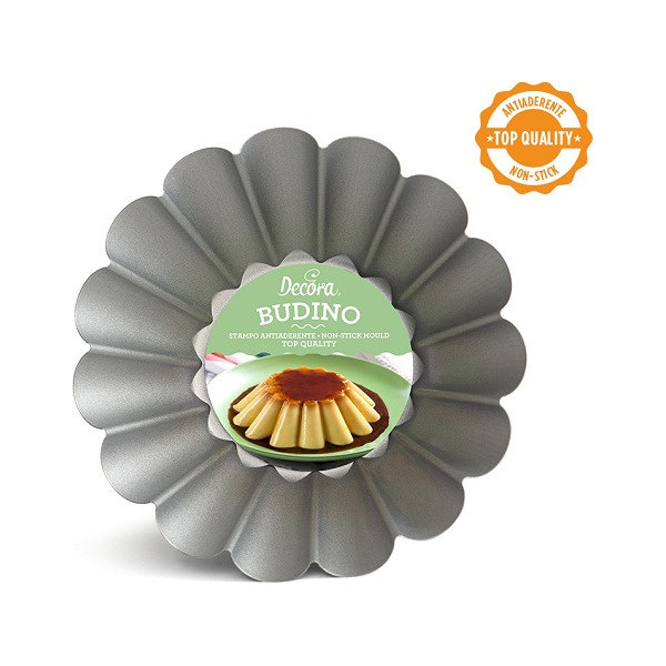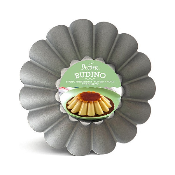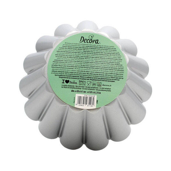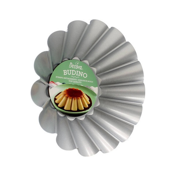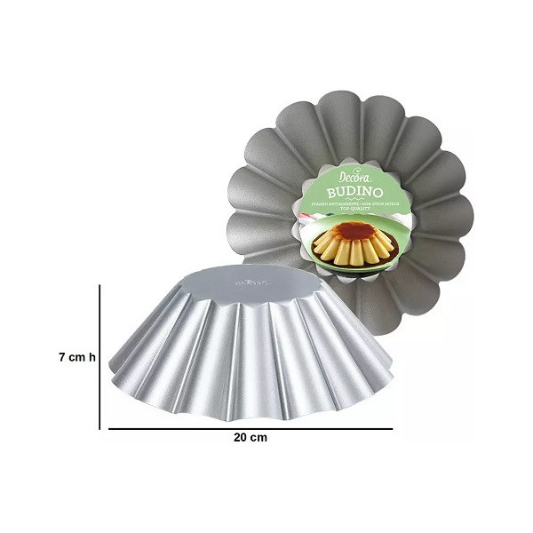 Stampo da forno con tubo per torta budino a margherita o per torta babà, da Decora, di dimensioni: diametro 20 cm oppure ø24 cm oppure ø28 cm ed altezza 8,5 cm in metallo antiaderente.