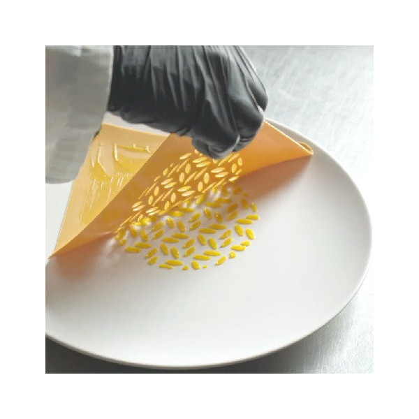Utilizzo: decorazioni del piatto di portata di preparazioni salate o di dessert, semifreddi, dolci, torte, gelati. da spalmare con un gel o un cremoso.