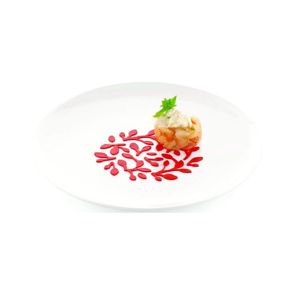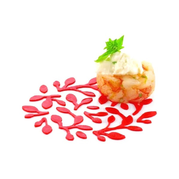 Utilizzo: decorazioni del piatto di portata di preparazioni salate o di dessert, semifreddi, dolci, torte, gelati. da spalmare con un gel o un cremoso.