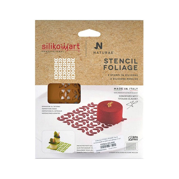 Con gli stencil foliage Silikomart crei decori fogliame 100x100xh1 mm, ideale per decorazioni veloci e perfette per dessert al piatto o creazioni salate con estrema facilità.