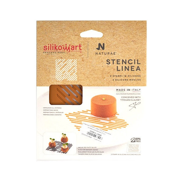 Con gli stencil linea Silikomart crei decori geometrici di line 100x100xh1 mm, ideale per decorazioni veloci e perfette per dessert al piatto o creazioni salate con estrema facilità.