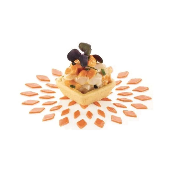 Utilizzo: decorazioni del piatto di portata di preparazioni salate o di dessert, semifreddi, dolci, torte, gelati. da spalmare con un gel o un cremoso.