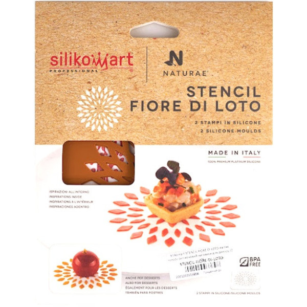 Con gli stencil fiore di loto Silikomart crei decori fiori ⌀100 h 1 mm, ideale per decorazioni veloci e perfette per dessert al piatto o creazioni salate con estrema facilità.