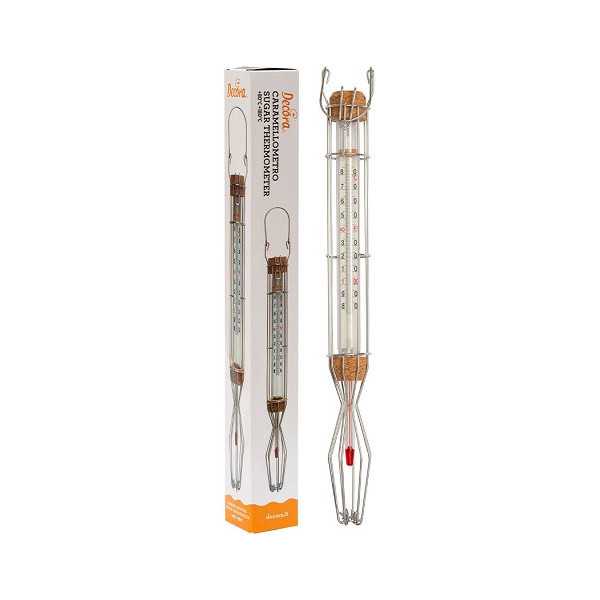 Caramellometro Decora: termometro per lo zucchero, semplice da usare, con gabbia metallica e gancio di misurazione +80 +1800°C da Decora. Utile per realizzare sciroppi e caramello.
