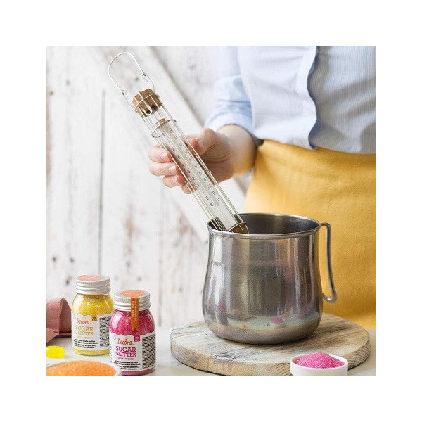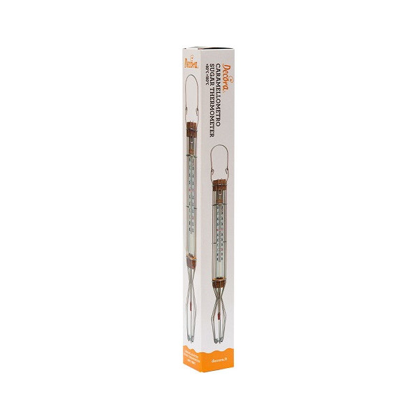 Il caramellometro Decora è un termometro per lo zucchero, semplice da usare, con gabbia metallica e gancio di misurazione +80 +1800°C da Decora. Utile per realizzare sciroppi e caramello.