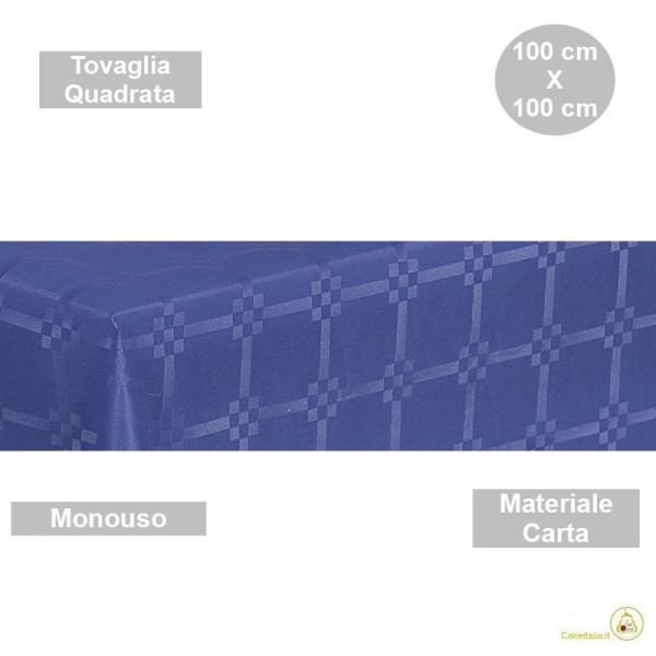 Tovaglia monouso di forma quadrata di lato 100 cm in carta politenata o impermeabile, con effetto damascato o lucido, a fondo pieno colore blu.
