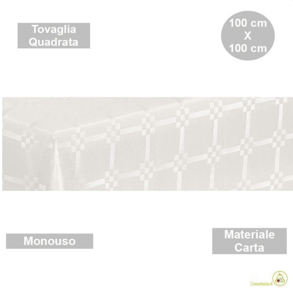 Tovaglia monouso di forma quadrata di lato 100 cm in carta politenata o impermeabile, con effetto damascato o lucido, a fondo pieno colore bianco.