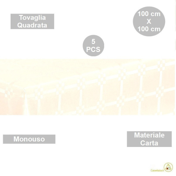 5 Tovaglie monouso di forma quadrata di lato 100 cm in carta politenata o impermeabile, con effetto damascato o lucido, a fondo pieno colore panna.