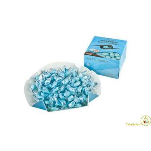 Mandorla tostata ricoperta di cioccolato bianco e fondente, confettati azzurri ed incartati singolarmente in vassoio da 500 g.