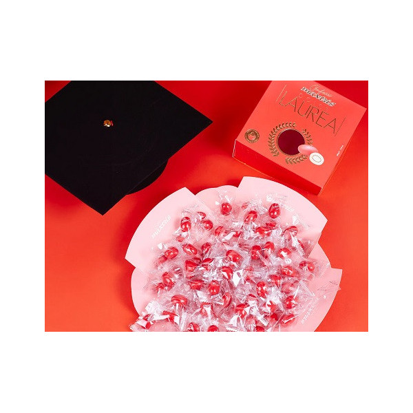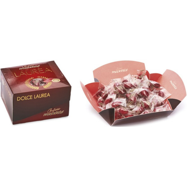 Dolce Laurea Rossi 500 g confetti Maxtris: mandorla tostata ricoperta di cioccolato bianco e fondente, confettati rossi ed incartati singolarmente in vassoio da 500 g.