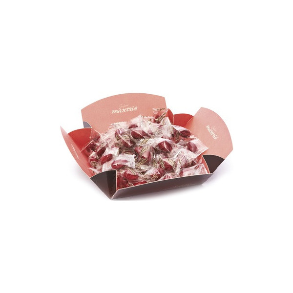 Vassoio Cadeaux Twist Maxtris Rosso: confetti con mandorla tostata ricoperta da cioccolato fondente e bianco e da un sottile strato di zucchero, in vassoio da 500 g.
