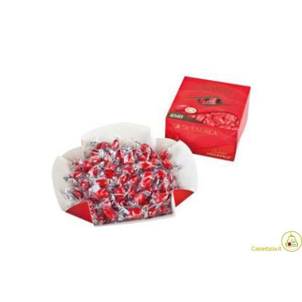 Dolce Laurea Rossi 500 g confetti Maxtris: mandorla tostata ricoperta di cioccolato bianco e fondente, confettati rossi ed incartati singolarmente in vassoio da 500 g