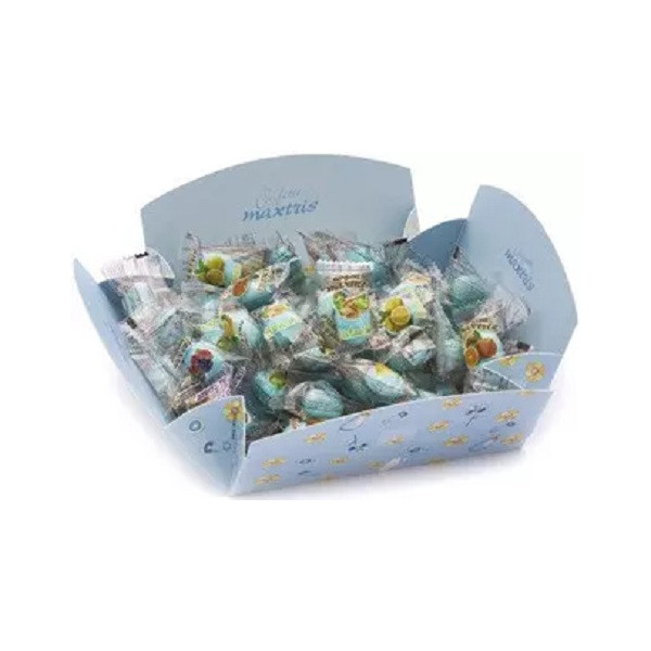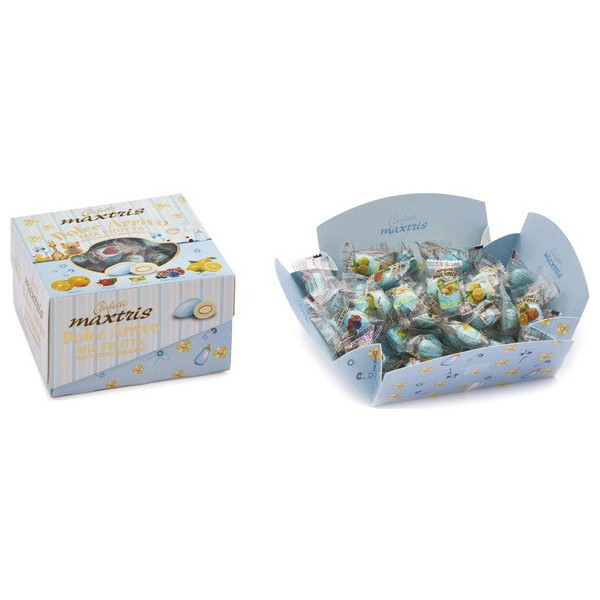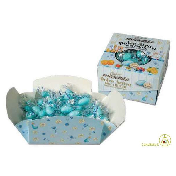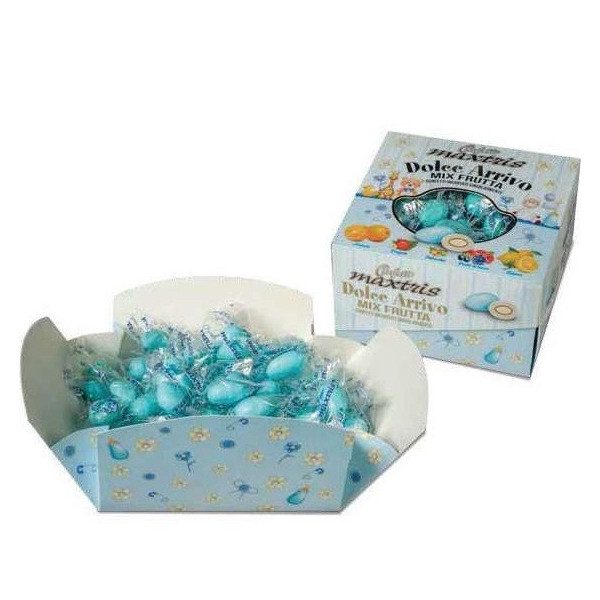 Dolce Arrivo Mix Frutta Azzurro in vassoio da 500 g. Confetti Maxtris, ciocomandorla azzurri, incartati singolarmente. Ideali per nascita bimbo, battesimo compleanno comunione o evento a tema azzurro.
