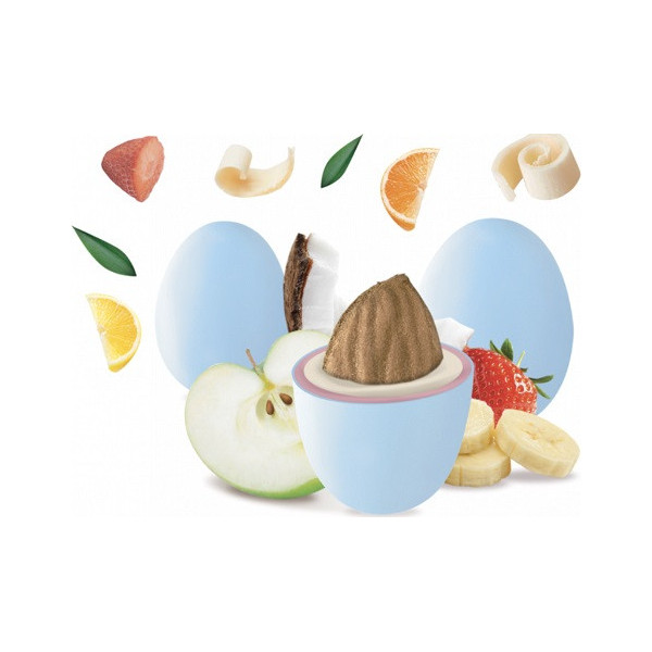 Confetti con mandorla ricoperta al cioccolato bianco ai gusti assortiti di frutta, incartati singolarmente.