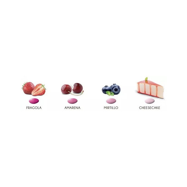Confetti con mandorla ricoperta al cioccolato bianco ai gusti assortiti alle creme, incartati singolarmente: confetti amarena, confetti fragola, confetti mirtillo, confetto cheesecake.