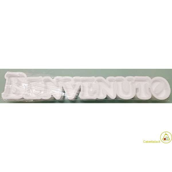 Vassoio Portaconfetti Benvenuto: vassoio in polistirolo porta confetti, con scritta Benvenuto, cofanetto da esposizione porta confetti di dimensioni 70x12x6 cm