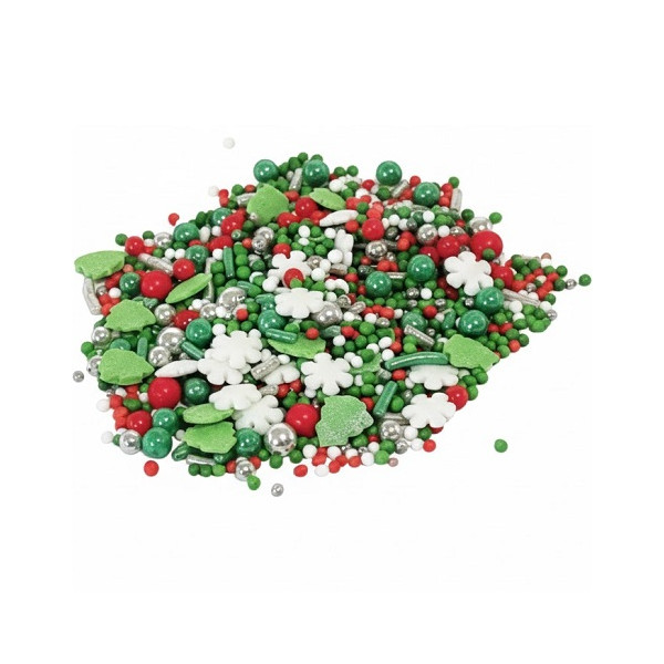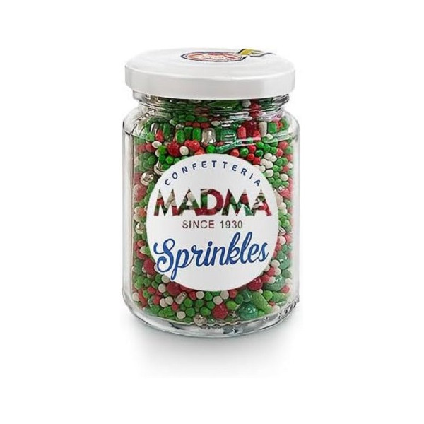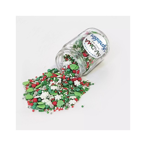 Sprinkles Mix Merry Christmas da 90 gr Madma: mix di decorazioni di zucchero, per dolci e biscotti, a tema natalizio, con alberelli, stelline, sferici, codette nei colori argento rosso verde e bianco