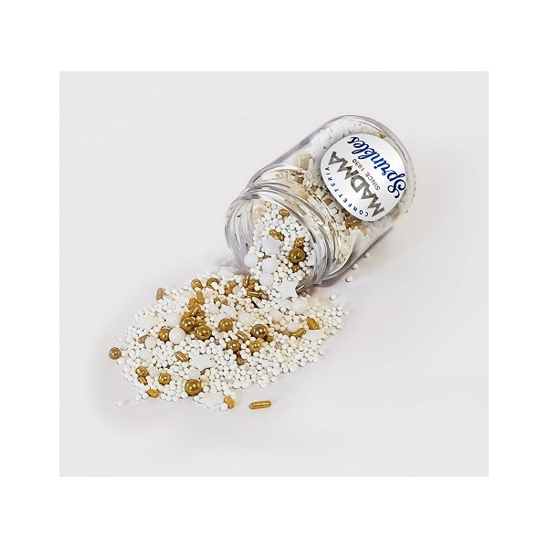 Sprinkles Mix White Christmas Madma da 90 g: mix di decorazioni di zucchero a tema natalizio, per dolci e biscotti, con alberelli, stelline, sferici, codette nei colori oro e bianco