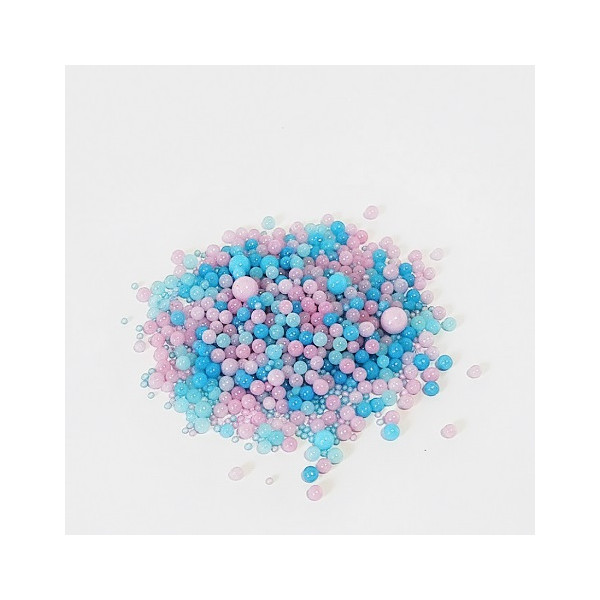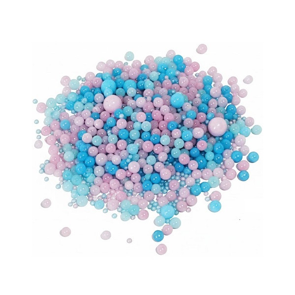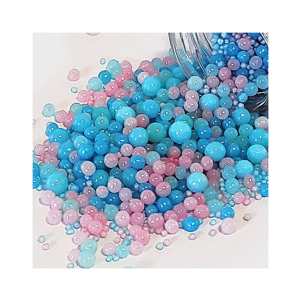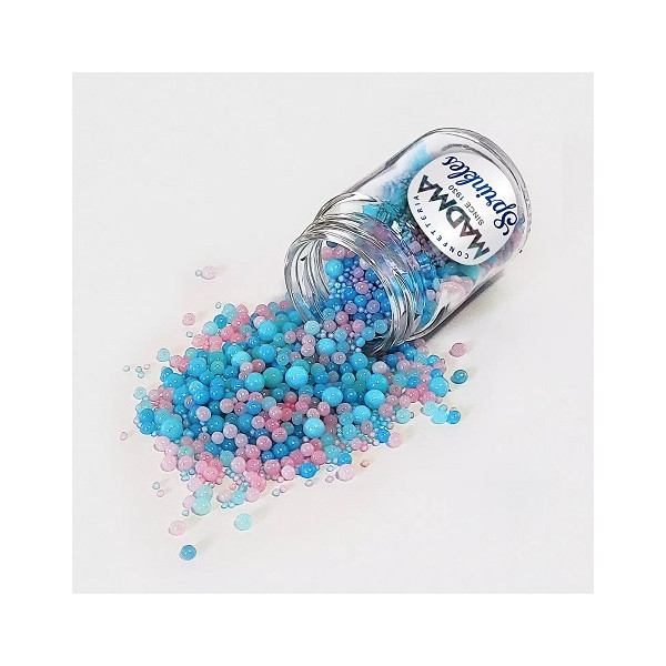 Sprinkles Mix Gender Reveal Madma 90 g: decorazioni di zucchero a tema gender reveal, con sferici di varie dimensioni, colorati rosa e celeste.