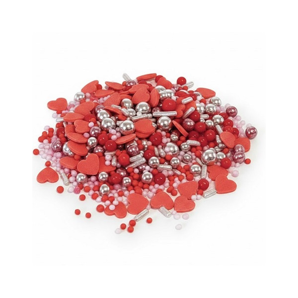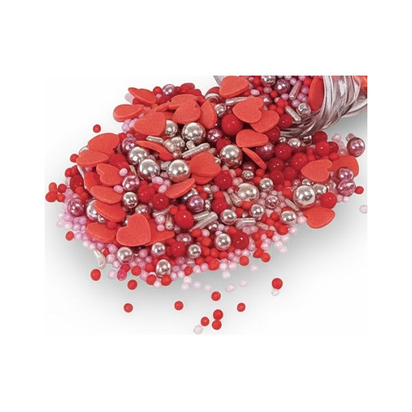 Sprinkles Mix Falling in Love Madma da 90 g: mix di decorazioni a tema amore, con cuoricini, sferici e codette nei colori argento, rosso e rosa, in barattolo di vetro salva freschezza