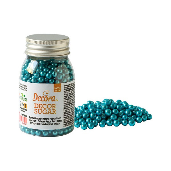 Perle di zucchero azzurre metallizzate, da 100 g e diametro 5 mm, linea Decorsugar metallizzati Decora.
